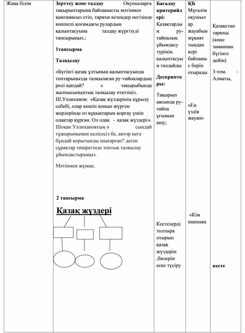 Зерттеу және талдау Оқушыларға тақырыптарына байланысты мәтінмен қамтамасыз етіп, тарихи кезеңдер негізінде көшпелі қоғамдағы рулардың қалыптасуына талдау жүргізуді тапсырыңыз.; 1тапсырма Талқылау «Бүгінгі қазақ ұлтының қалыптасуында топтарыңызда талқылаған ру-тайпалардың рөлі қандай?» тақырыбында жалпысыныптық талқылау өткізіңіз. Ш.Уәлиханов: «Қазақ жүздерінің құрылу себебі, олар көшіп қонып жүрген жерлерінде өз құқықтарын қорғау үшін одақтар құрған. Ол одақ - қазақ жүздері». Шоқан Уәлихановтың осындай тұжырымымен келісесіз бе, автор неге бұндай қорытынды шығарған? деген сұрақтар төңірегінде топтық талқылау ұйымдастырыңыз. Мәтінмен жұмыс.