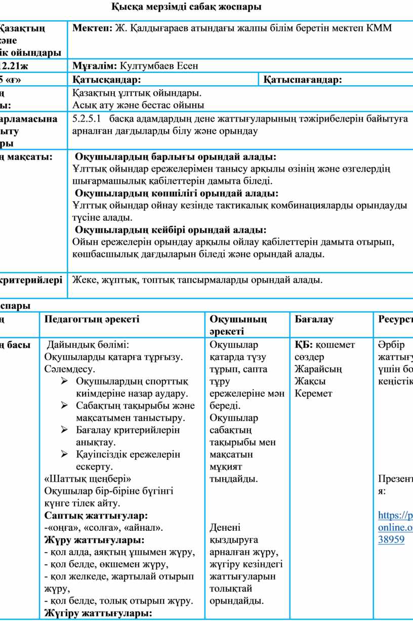 Дескриптор: - асық ату ойынының түрлерін, ережелерін біледі; - асық атауларын есінде сақтайды; - ойынды ережесіне сай ойнай алады;