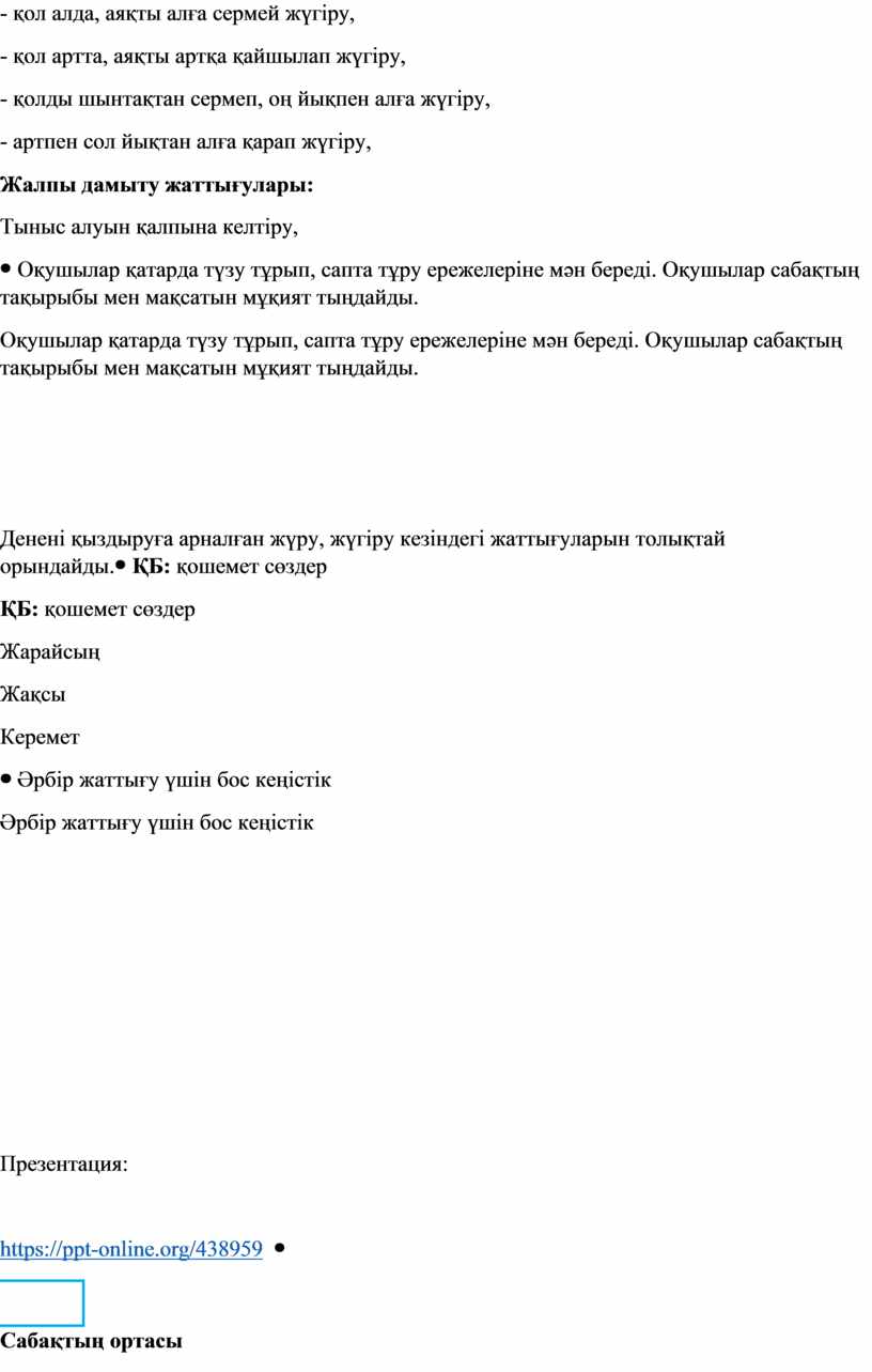 Дайындық бөлімі: Оқушыларды қатарға тұрғызу. Сәлемдесу. Ø Оқушылардың спорттық киімдеріне назар аудару. Ø Сабақтың тақырыбы және мақсатымен таныстыру. Ø Бағалау критерийлерін анықтау. Ø Қауіпсіздік ережелерін ескерту. «Шаттық щеңбері» Оқушылар бір-біріне бүгінгі күнге тілек айту. Саптық жаттығулар: -«оңға», «солға», «айнал». Жүру жаттығулары: - қол алда, аяқтың ұшымен жүру, - қол белде, өкшемен жүру, - қол желкеде, жартылай отырып жүру, - қол белде, толық отырып жүру. Жүгіру жаттығулары: - қол алда, аяқты алға сермей жүгіру, - қол артта, аяқты артқа қайшылап жүгіру, - қолды шынтақтан сермеп, оң йықпен алға жүгіру, - артпен сол йықтан алға қарап жүгіру, Жалпы дамыту жаттығулары: Тыныс алуын қалпына келтіру,