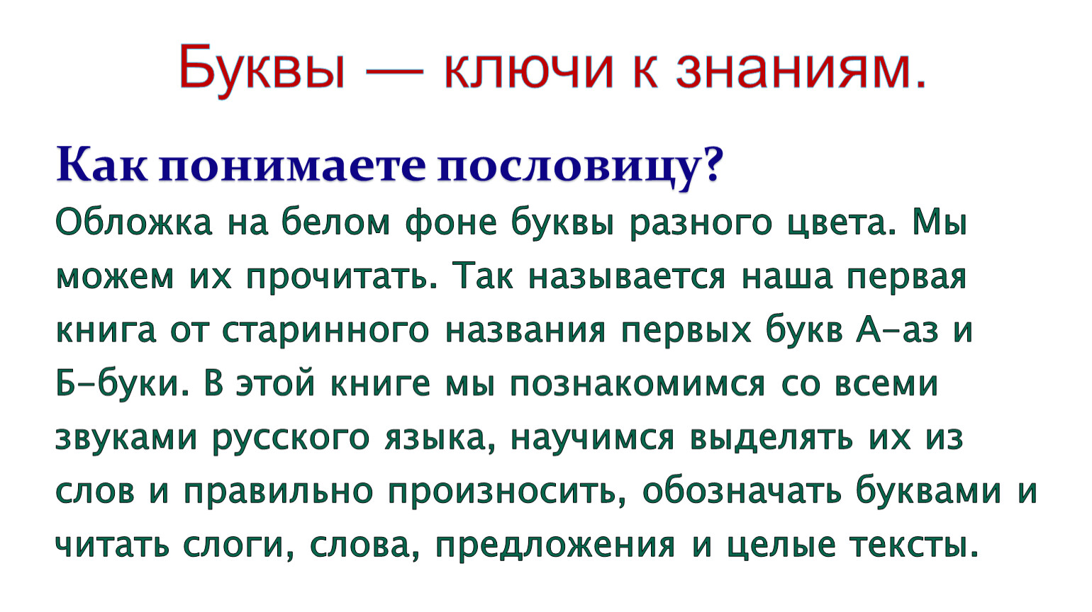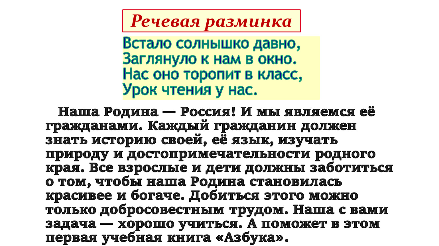 Наша Родина ― Россия! И мы являемся её гражданами. Каждый гражданин должен знать историю своей, её язык, изучать природу и достопримечательности родного края. Все взрослые и дети должны заботиться о том, чтобы наша Родина становилась красивее и богаче. Добиться этого можно только добросовестным трудом. Наша с вами задача ― хорошо учиться. А поможет в этом первая учебная книга «Азбука».