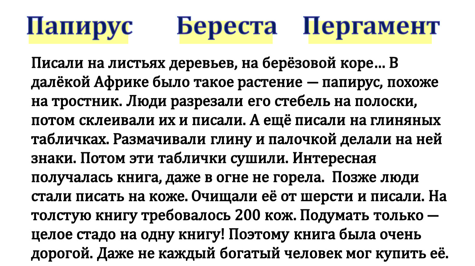Писали на листьях деревьев, на берёзовой коре… В далёкой Африке было такое растение ― папирус, похоже на тростник. Люди разрезали его стебель на полоски, потом склеивали их и писали. А ещё писали на глиняных табличках. Размачивали глину и палочкой делали на ней знаки. Потом эти таблички сушили. Интересная получалась книга, даже в огне не горела. Позже люди стали писать на коже. Очищали её от шерсти и писали. На толстую книгу требовалось 200 кож. Подумать только ― целое стадо на одну книгу! Поэтому книга была очень дорогой. Даже не каждый богатый человек мог купить её.