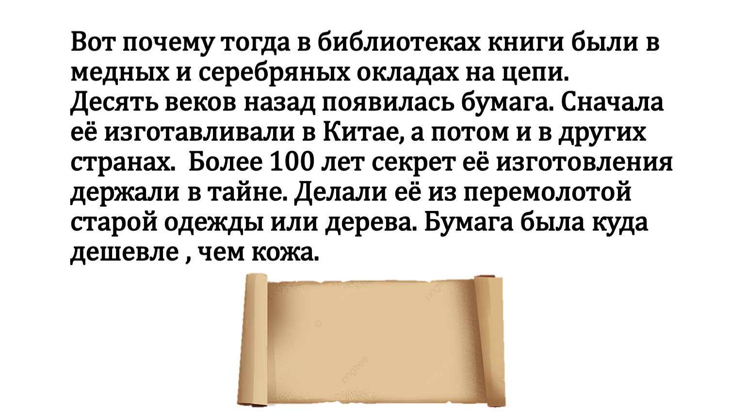 Десять веков назад появилась бумага. Сначала её изготавливали в Китае, а потом и в других странах. Более 100 лет секрет её изготовления держали в тайне. Делали её из перемолотой старой одежды или дерева. Бумага была куда дешевле , чем кожа.
