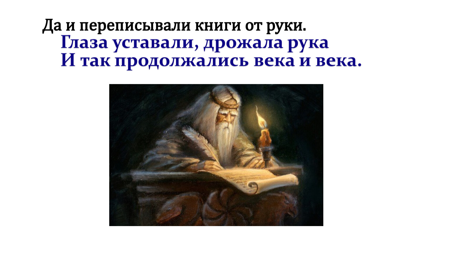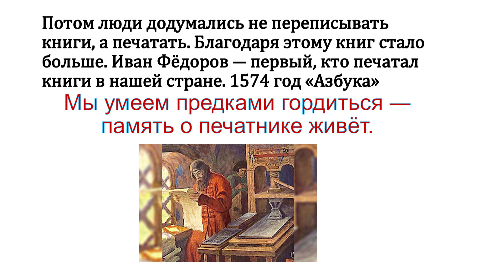 Потом люди додумались не переписывать книги, а печатать. Благодаря этому книг стало больше. Иван Фёдоров ― первый, кто печатал книги в нашей стране. 1574 год «Азбука»