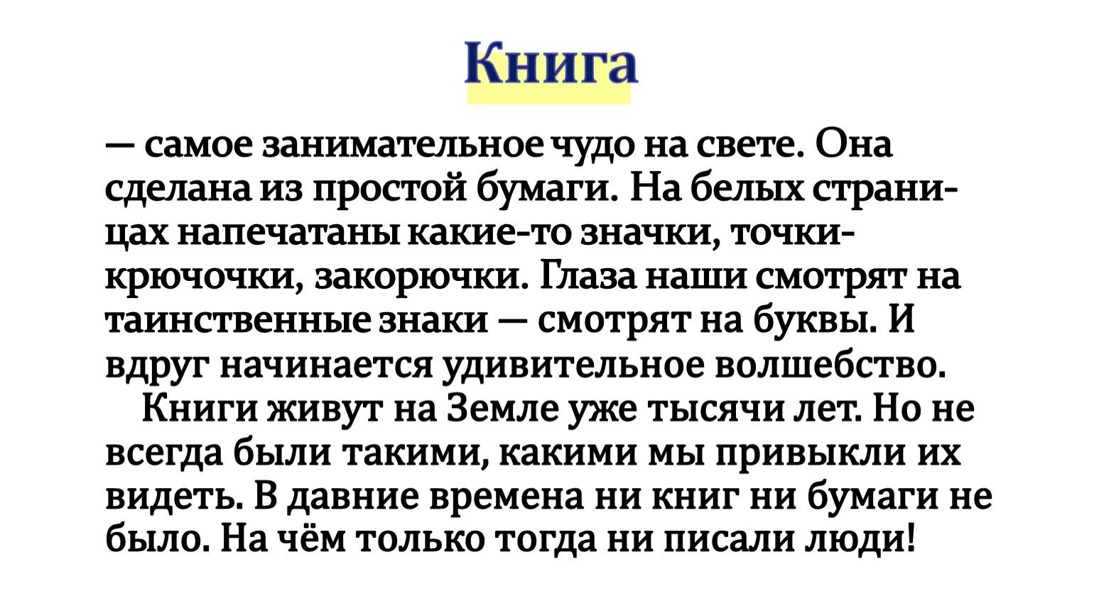 ― самое занимательное чудо на свете. Она сделана из простой бумаги. На белых страни-цах напечатаны какие-то значки, точки-крючочки, закорючки. Глаза наши смотрят на таинственные знаки ― смотрят на буквы. И вдруг начинается удивительное волшебство.