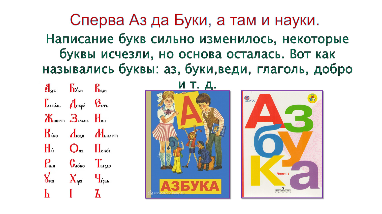 Написание букв сильно изменилось, некоторые буквы исчезли, но основа осталась. Вот как назывались буквы: аз, буки,веди, глаголь, добро и т. д.
