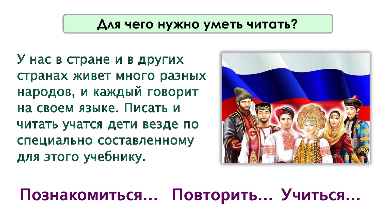 У нас в стране и в других странах живет много разных народов, и каждый говорит на своем языке. Писать и читать учатся дети везде по специально составленному для этого учебнику.