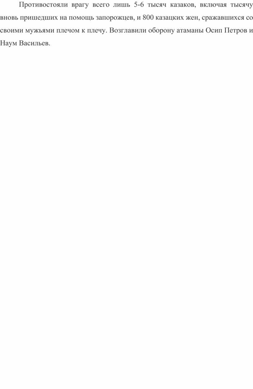 Противостояли врагу всего лишь 5-6 тысяч казаков, включая тысячу вновь пришедших на помощь запорожцев, и 800 казацких жен, сражавшихся со своими мужьями плечом к плечу. Возглавили оборону атаманы Осип Петров и Наум Васильев.
