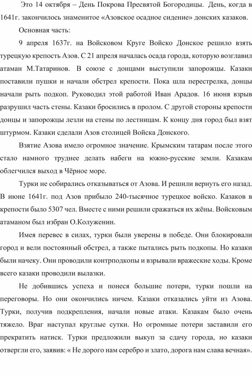 Это 14 октября – День Покрова Пресвятой Богородицы. День, когда в 1641г. закончилось знаменитое «Азовское осадное сидение» донских казаков.