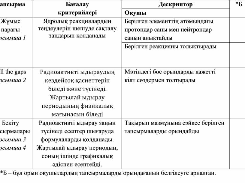 *Б – бұл орын оқушылардың тапсырмаларды орындағанын белгілеуге арналған.