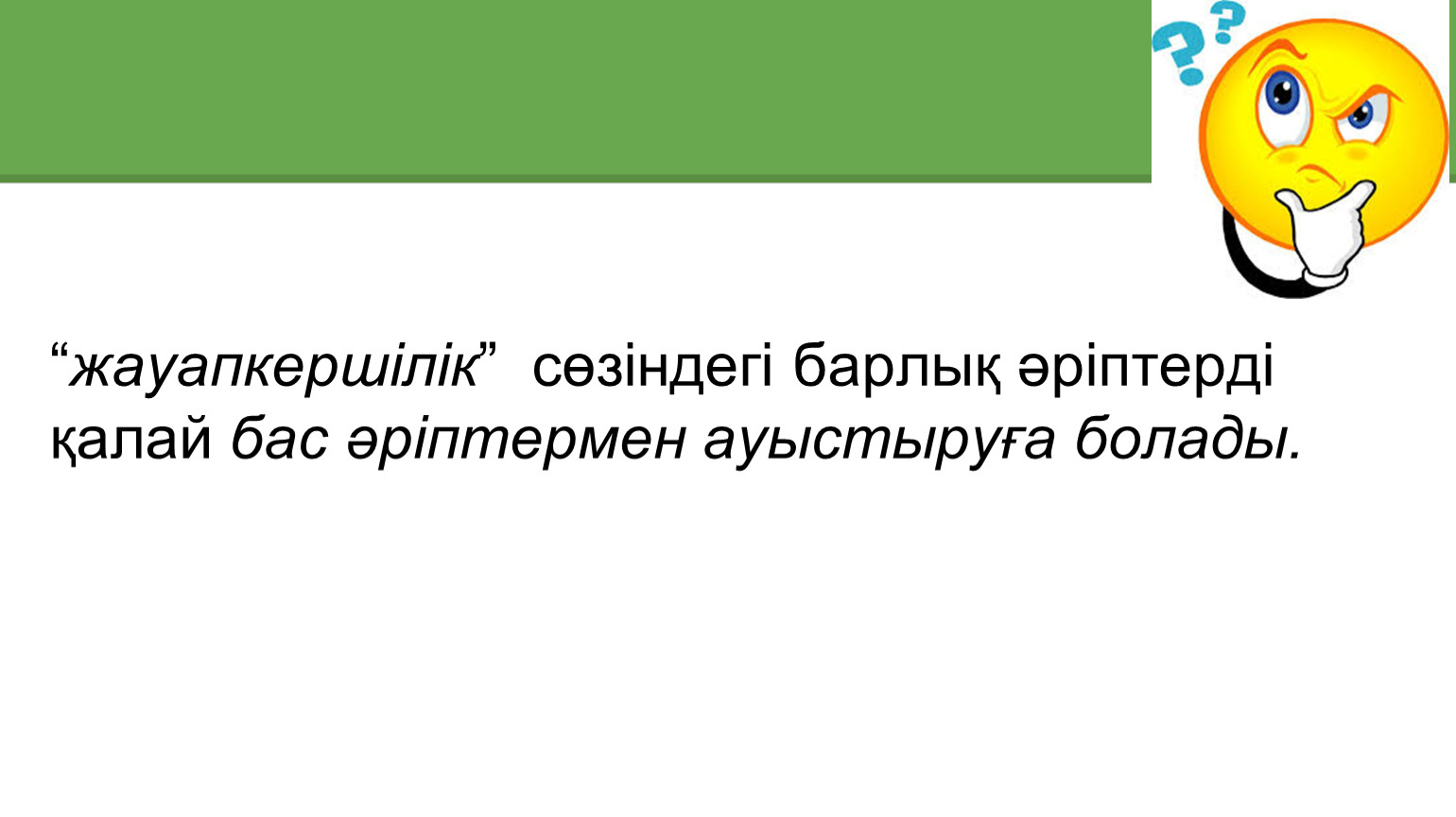 жауапкершілік” сөзіндегі барлық әріптерді қалай бас әріптермен ауыстыруға болады.