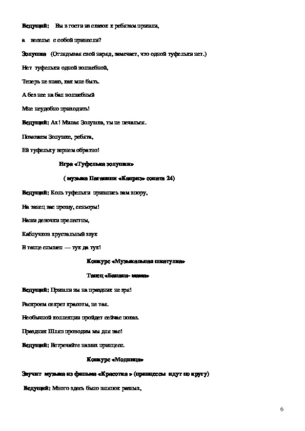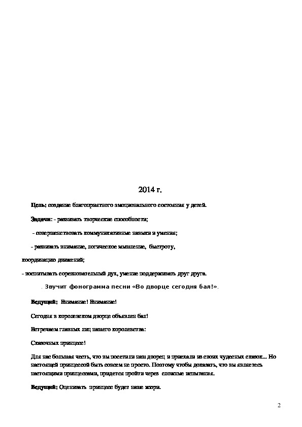 - воспитывать соревновательный дух, умение поддерживать друг друга.. Звучит фонограмма песни «Во дворце сегодня бал!».Бал сказочных принцесс в дошкольной группе.