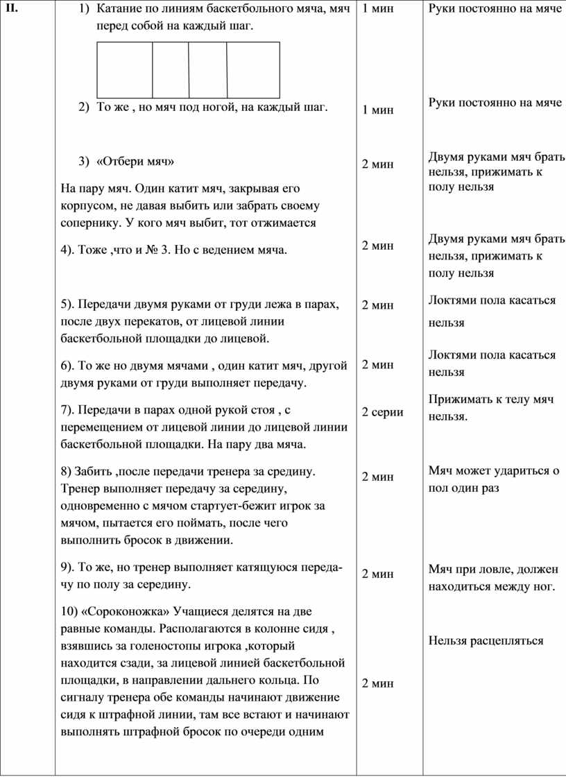 5). Передачи двумя руками от груди лежа в парах, после двух перекатов, от лицевой линии баскетбольной площадки до лицевой. 6). То же но двумя мячами , один катит мяч, другой двумя руками от груди выполняет передачу. 7). Передачи в парах одной рукой стоя , с перемещением от лицевой линии до лицевой линии баскетбольной площадки. На пару два мяча. 8) Забить ,после передачи тренера за средину. Тренер выполняет передачу за середину, одновременно с мячом стартует-бежит игрок за мячом, пытается его поймать, после чего выполнить бросок в движении. 9). То же, но тренер выполняет катящуюся переда- чу по полу за середину. 10) «Сороконожка» Учащиеся делятся на две равные команды. Располагаются в колонне сидя , взявшись за голеностопы игрока ,который находится сзади, за лицевой линией баскетбольной площадки, в направлении дальнего кольца. По сигналу тренера обе команды начинают движение сидя к штрафной линии, там все встают и начинают выполнять штрафной бросок по очереди одним мячом. Цель: забросить 5 раз быстрее команды-соперника. 11) То же , но нужно еще обогнуть препятствие во время движения. 12) Ведение с силой , на четвертый раз прижать к полу мяч. 13) то же, но после прижатия, нужно поднять мяч, ударяя по нему. 14). То же, но с прокатыванием мяча между ног, за спиной, под ногой.