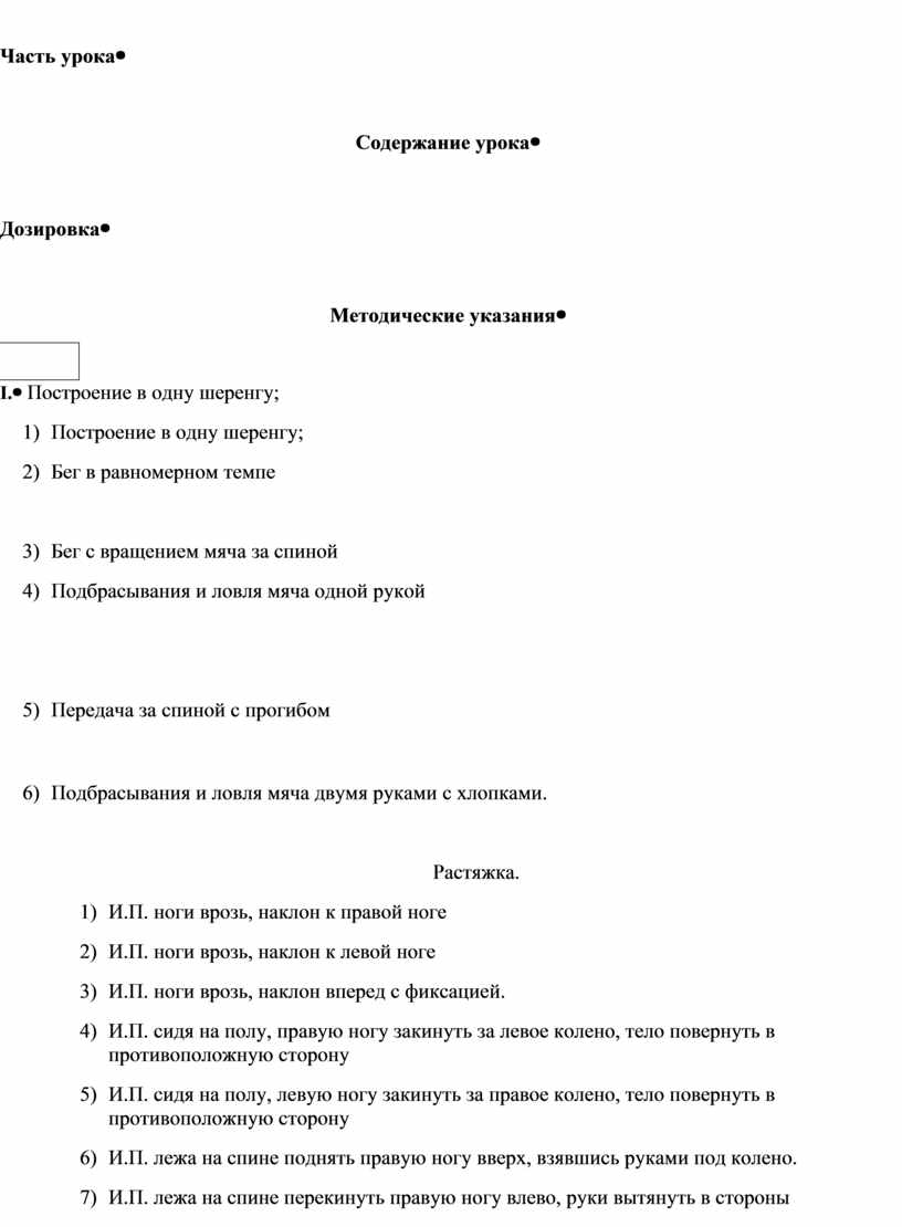Растяжка. 1) И.П. ноги врозь, наклон к правой ноге 2) И.П. ноги врозь, наклон к левой ноге 3) И.П. ноги врозь, наклон вперед с фиксацией. 4) И.П. сидя на полу, правую ногу закинуть за левое колено, тело повернуть в противоположную сторону 5) И.П. сидя на полу, левую ногу закинуть за правое колено, тело повернуть в противоположную сторону 6) И.П. лежа на спине поднять правую ногу вверх, взявшись руками под колено. 7) И.П. лежа на спине перекинуть правую ногу влево, руки вытянуть в стороны 8) И.П. лежа на спине перекинуть левую ногу вправо, руки вытянуть в стороны 9) Стоя возле стены растяжка икроножной мышцы 10) ОРУ в парах 1. Бег с захлестыванием голени назад с ведением мяча 2. Бег с высоким подниманием колена с ведением мяча 3. Прыжки на правой ноге с ведением мяча 4. Прыжки на левой ноге с ведением мяча 5. Ходьба в приседе до середины с ведением мяча, от середины подскоки с ведением мяча. 11). Прыжки друг через друга в колоннах, до конца спортивного зала и обратно. 12). «Поймать мяч партнера» Игроки располагаются на боковых линиях баскетбольной площадки, напротив друг друга. По сигналу, одновременно подкидывают мяч вверх и бегут после этого ловить мяч партнера на противоположную сторону. Мяч о пол удариться не должен.
