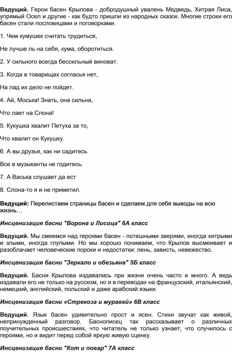 Ведущий: Перелистаем страницы басен и сделаем для себя выводы на всю жизнь…