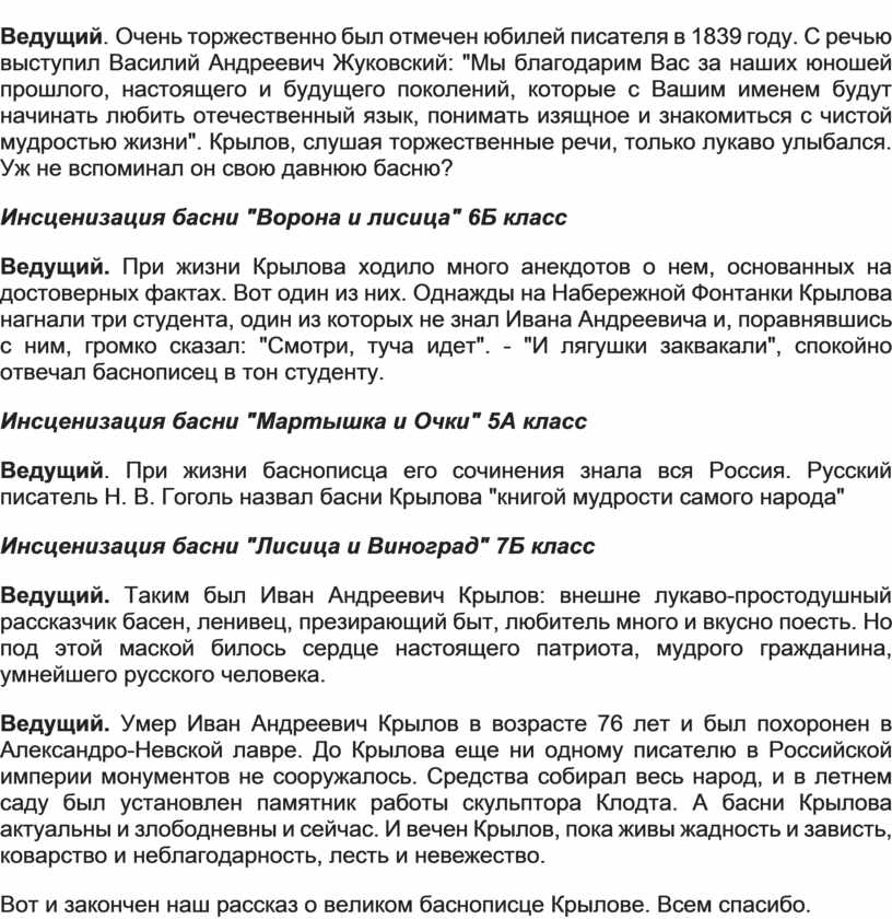 Ведущий. Умер Иван Андреевич Крылов в возрасте 76 лет и был похоронен в Александро-Невской лавре. До Крылова еще ни одному писателю в Российской империи монументов не сооружалось. Средства собирал весь народ, и в летнем саду был установлен памятник работы скульптора Клодта. А басни Крылова актуальны и злободневны и сейчас. И вечен Крылов, пока живы жадность и зависть, коварство и неблагодарность, лесть и невежество.