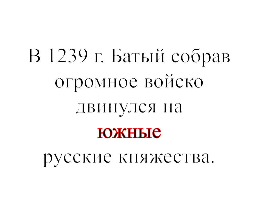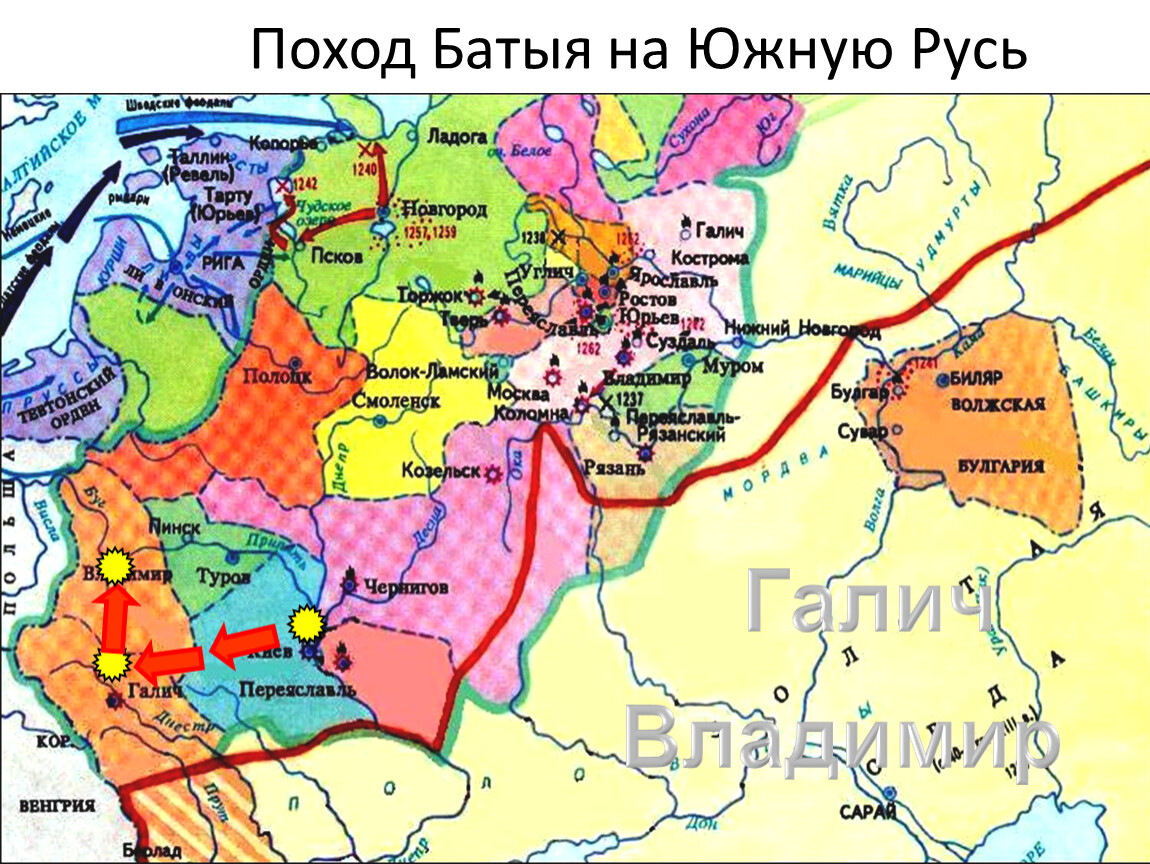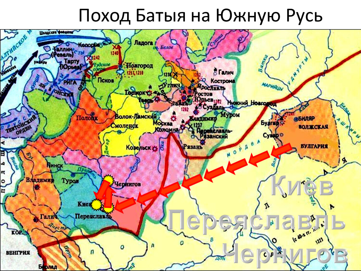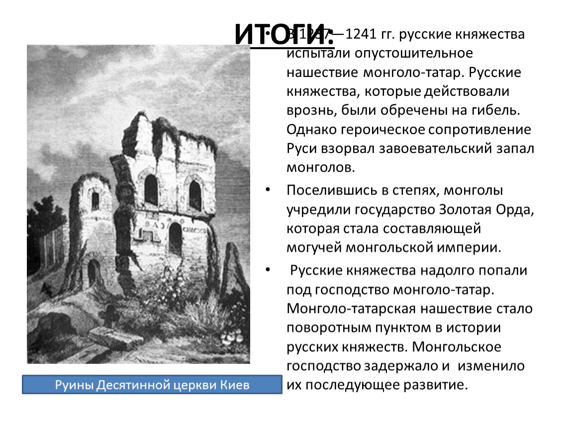 Русские княжества надолго попали под господство монголо-татар. Монголо-татарская нашествие стало поворотным пунктом в истории русских княжеств. Монгольское господство задержало и изменило их последующее развитие.
