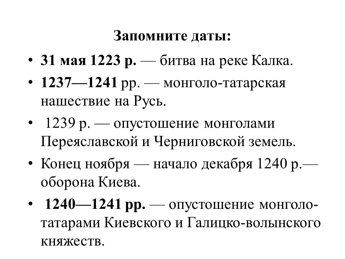 1240—1241 рр. — опустошение монголо-татарами Киевского и Галицко-волынского княжеств.