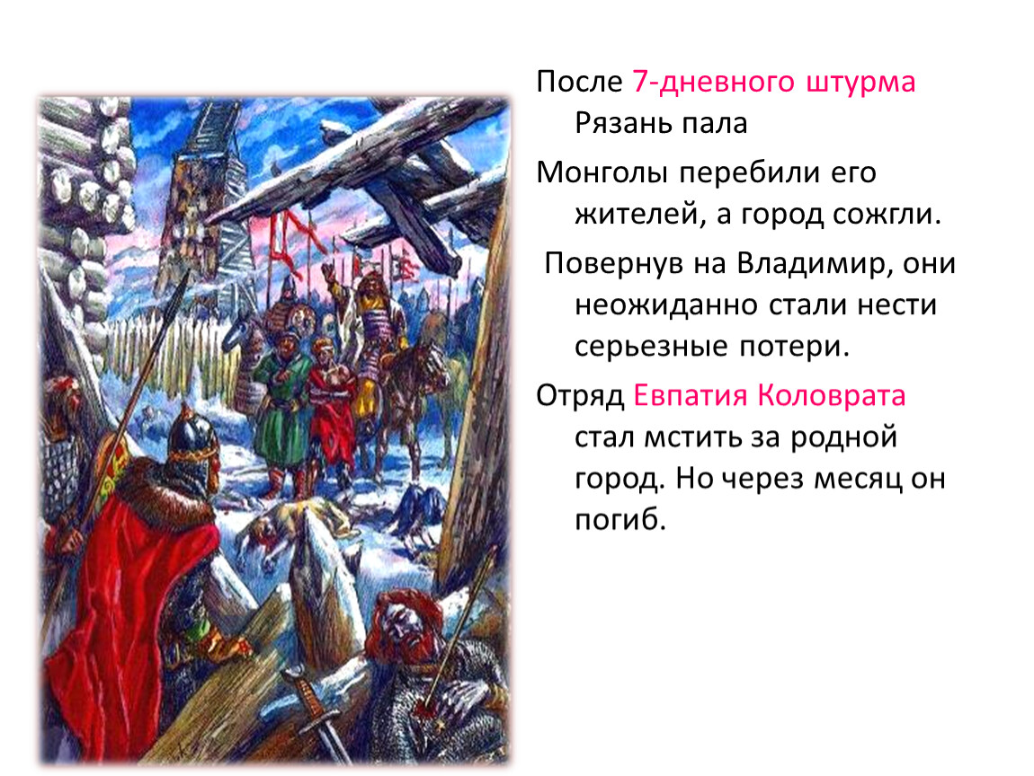 Отряд Евпатия Коловрата стал мстить за родной город. Но через месяц он погиб.
