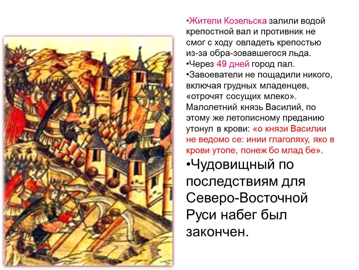 Жители Козельска залили водой крепостной вал и противник не смог с ходу овладеть крепостью из-за обра-зовавшегося льда.