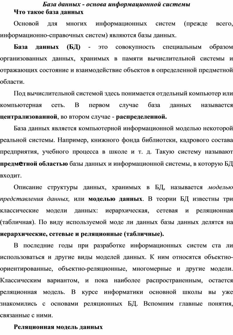 Основой для многих информационных систем (прежде всего, информационно-справочных систем) являются базы данных.