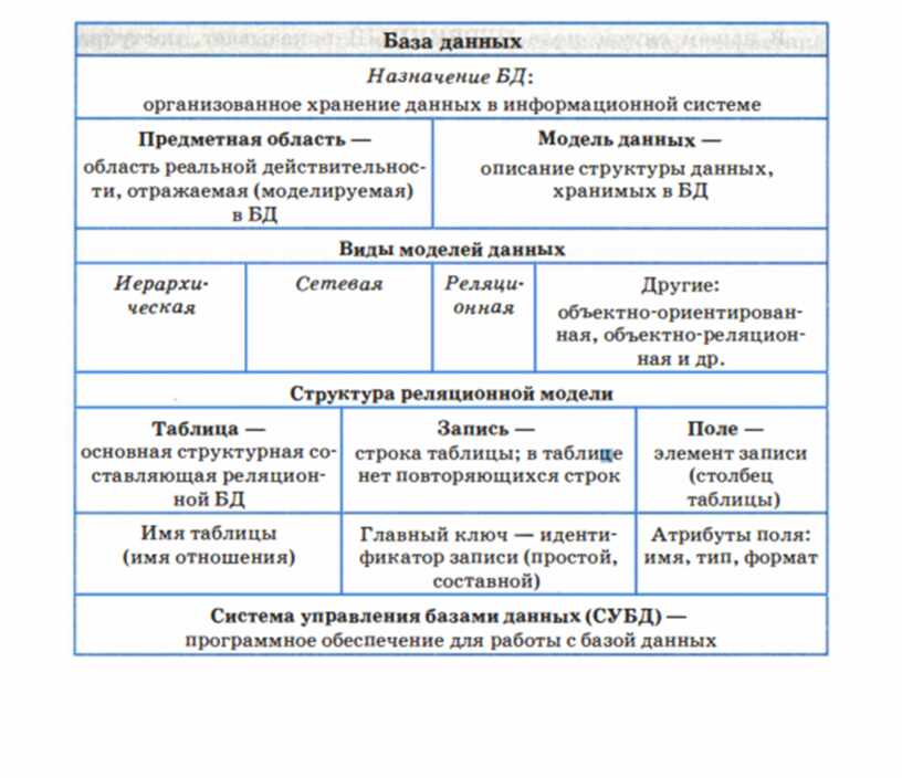 В последние годы при разработке информационных систем ста ли использоваться и другие виды моделей данных. К ним относятся объектно-ориентированные, объектно-реляционные, многомерные и другие модели. Классическим вариантом, и пока наиболее распространенным, остается реляционная модель. В курсе информатики основной школы вы уже знакомились с основами реляционных БД. Вспомним главные понятия, связанные с ними.