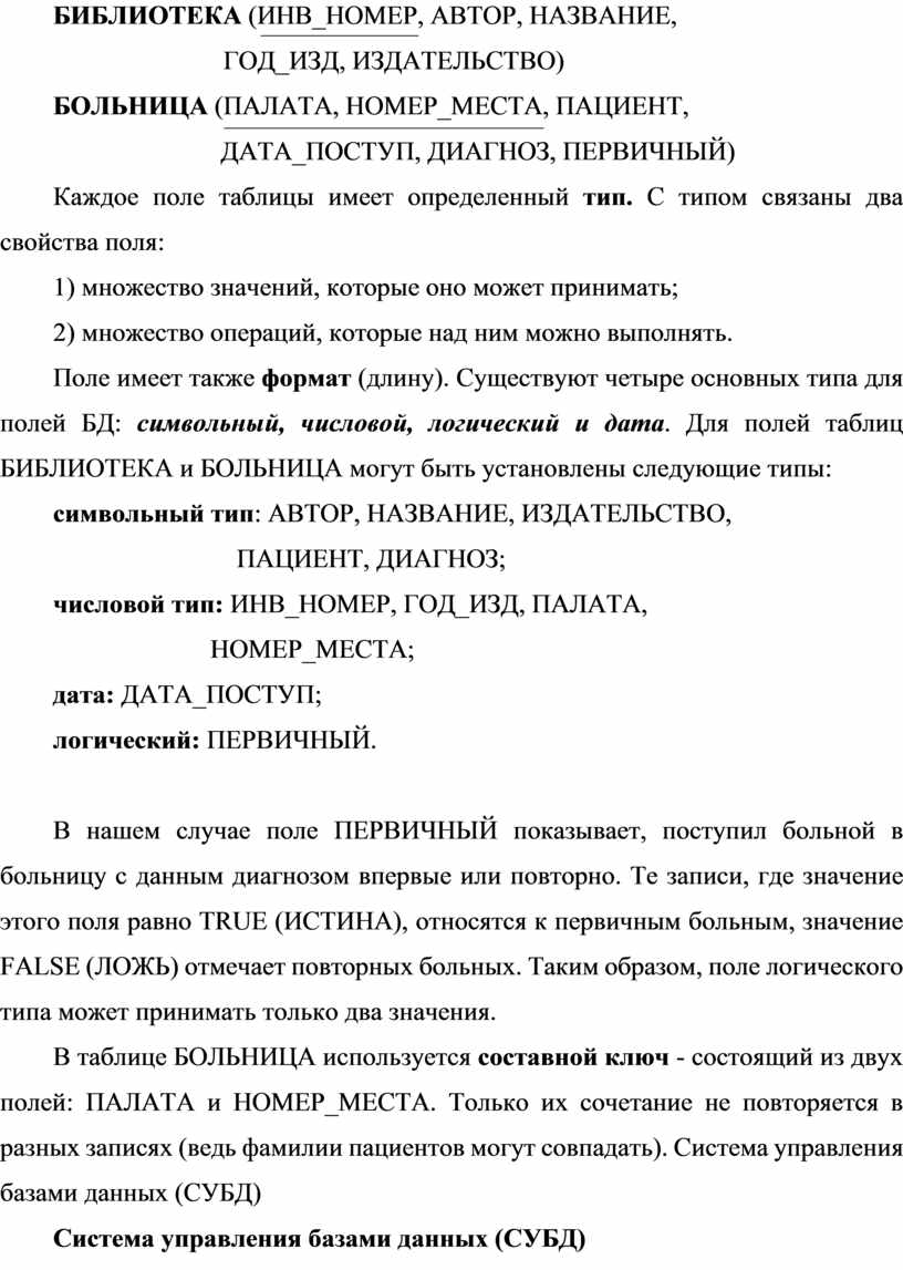 В таблице БОЛЬНИЦА используется составной ключ - состоящий из двух полей: ПАЛАТА и НОМЕР_МЕСТА. Только их сочетание не повторяется в разных записях (ведь фамилии пациентов могут совпадать). Система управления базами данных (СУБД)
