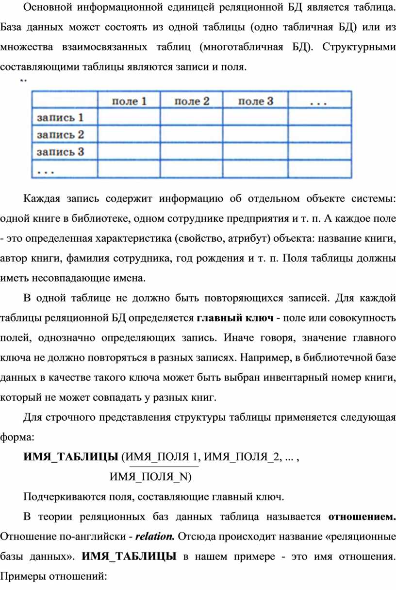 В теории реляционных баз данных таблица называется отношением. Отношение по-английски - relation. Отсюда происходит название «реляционные базы данных». ИМЯ_ТАБЛИЦЫ в нашем примере - это имя отношения. Примеры отношений: