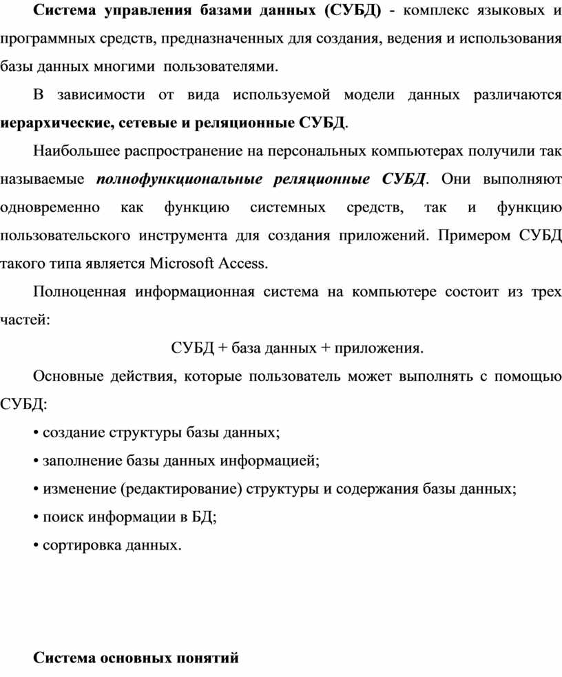 Система управления базами данных (СУБД) - комплекс языковых и программных средств, предназначенных для создания, ведения и использования базы данных многими пользователями.
