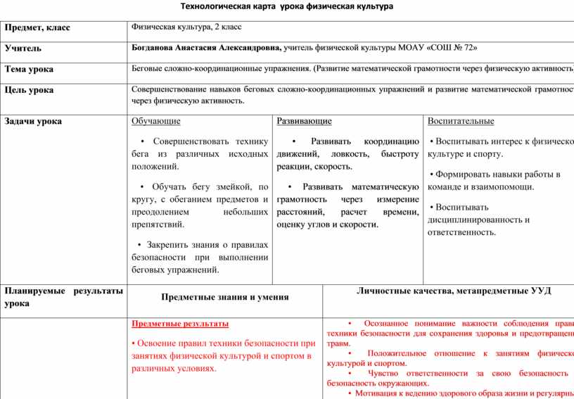 Технологическая карта урока физическая культура