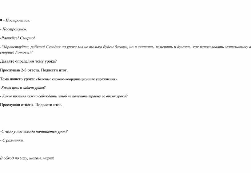 - Построились. -Равняйсь! Смирно! -"Здравствуйте, ребята! Сегодня на уроке мы не только будем бегать, но и считать, измерять и думать, как использовать математику в спорте! Готовы?" Давайте определим тему урока? Прослушав 2-3 ответа. Подвести итог. Тема нашего урока: «Беговые сложно-координационные упражнения». -Какая цель и задачи урока? - Какие правила нужно соблюдать, чтоб не получить травму во время урока? Прослушав ответы. Подвести итог.
