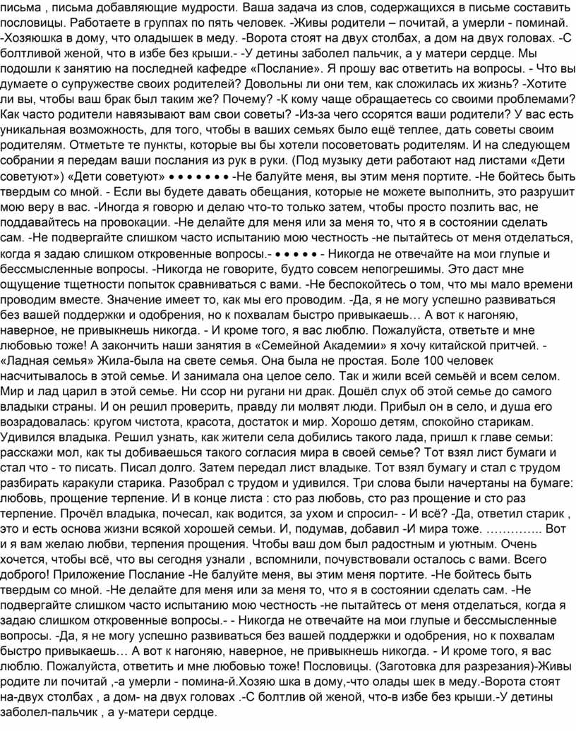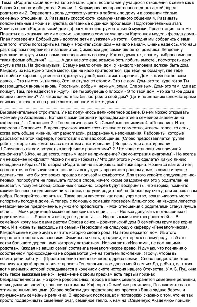 Тема: «Родительский дом- начало начал». Цель: воспитание у учащихся отношения к семье как к базовой ценности общества. Задачи: 1. Формирование нравственного долга детей перед родителями 2. Определить роль детского участия в заботах по дому и в создании тёплых семейных отношений. 3. Развивать способности коммуникативного общения 4. Развивать положительные эмоции и чувства, связанные с данной проблемой. Подготовительный этап. Запись песен «Родительский дом», фрагменты инструментальной музыки. Презентация по теме Плакаты с высказываниями о семье, коллажи о семьях учащихся Картонная модель фасада дома.- План проведения Добрый день дорогие дети и уважаемые гости . Сегодня мы собрались с вами для того, чтобы поговорить на тему « Родительский дом – начало начал». Очень надеюсь, что наш разговор вам понравится и запомнится. Символом дня семьи является ромашка. Лепестки у ромашки по кругу и мы с вами расположились по кругу. Как вы думаете , почему выбрана именно такая форма общения?............ А для нас это ещё возможность побыть вместе , посмотреть друг другу в глаза. На фоне музыки. Всему начало отчий дом. У каждого человека должен быть дом. Каждому из нас нужно такое место, где не надо притворяться, где тебя не обманут, где тебе спокойно и хорошо, где можно отдохнуть душой, как в стихотворении : Дом, как известно всем давно, - Это ни стены, ни окно, Это ни стулья со столом; Это не дом. Дом- это то, куда готов Ты возвращаться вновь и вновь, Яростным, добрым, нежным, злым, Еле живым. Дом- это там, где вас поймут, Там, где надеются и ждут,- Где ты забудешь о плохом - Э то твой дом. Что же такое дом в вашем понимании? Из каких качеств вы бы построили свой дом? (Дети по желанию фломастерами вписывают качества на ранее заготовленном макете дома) ................................................................................ ................................................................................ . Вы замечательные строители. У нас получилось великолепное здание. В нём можно открывать «Семейную Академию». Вот мы с вами сегодня и проведём занятие в семейной академии на кафедрах. 1. «Согласие» 2. «Генеалогическая» 3. «Семейные реликвии» 4. «Послание» Итак, кафедра «Согласие». В древнерусском языке «со»- означает совместно, «глас»- голос, то есть , когда есть общее мнение, нет разногласий, раздражения, непонимания. Лаборанты, которые работают на этой кафедре, подготовили для вас сообщение. (Слово предоставляется группе ребят, которые знакомят класс с итогами анкетирования.) Вопросы для анкетирования: 1.Случалось ли вам вступать в конфликт с родителями? 2. Что чаще становиться причиной конфликта? 3.Кто, чаще всего, первым идёт на примирение? (демонстрация диаграмм).- Но всегда ли неизбежен конфликт? Можно ли его избежать? Что для этого нужно сделать? Какую линию поведения избрать? Поговорка «Родителей не выбирают» всё-таки верна. Нравится вам или нет, но достаточно большую часть жизни вы вынуждены провести в родном доме, в семье и лучше сделать так , что бы это время прошло с пользой и комфортом. Для этого усвойте следующее: -во-первых, попробуйте не повышать голос в споре, ничего кроме раздражения это у родителей не вызовет. К тому же слова, сказанные спокойно, скорее будут восприняты. -во-вторых, помните: какими бы несправедливыми ни казались поступки родителей, по большому счёту, они желают вам добра. Постарайтесь понять их. Такие ваши качества 