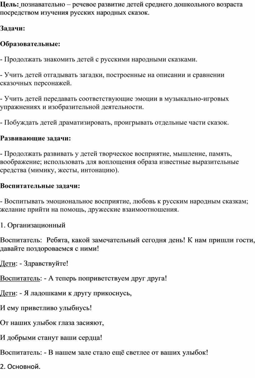 Цель: познавательно – речевое развитие детей среднего дошкольного возраста посредством изучения русских народных сказок.