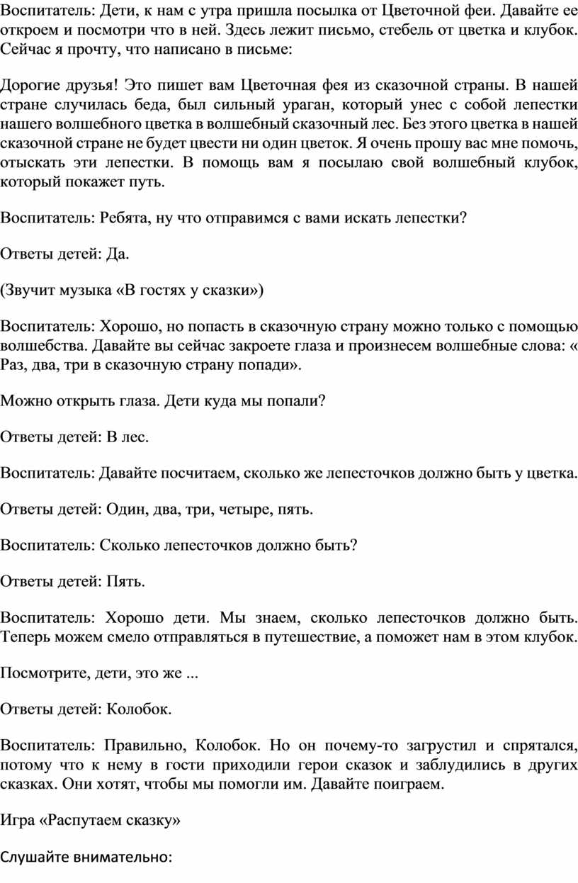 Воспитатель: Правильно. Дети, посмотрите, колобок снова стал радостным. А за то, что вы помогли героям сказок попасть в свои сказки, он отдает лепесток с нашего цветка. Спасибо тебе Колобок. До свидания. А мы дети отправляемся дальше.