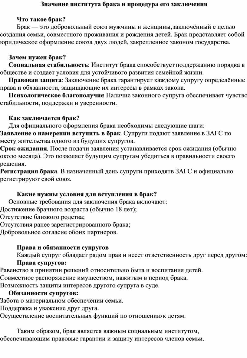 Таким образом, брак является важным социальным институтом, обеспечивающим правовые гарантии и защиту интересов членов семьи.