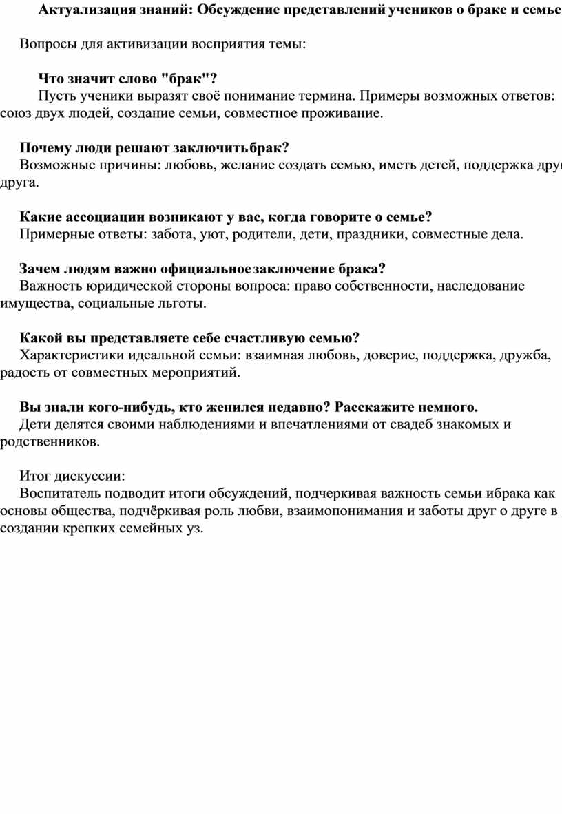 Актуализация знаний: Обсуждение представлений учеников о браке и семье