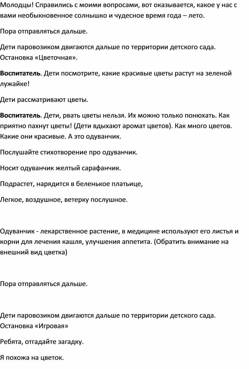 Воспитатель. Дети, рвать цветы нельзя. Их можно только понюхать. Как приятно пахнут цветы! (Дети вдыхают аромат цветов). Как много цветов. Какие они красивые. А это одуванчик.