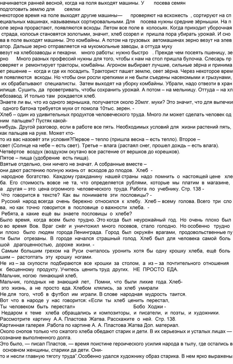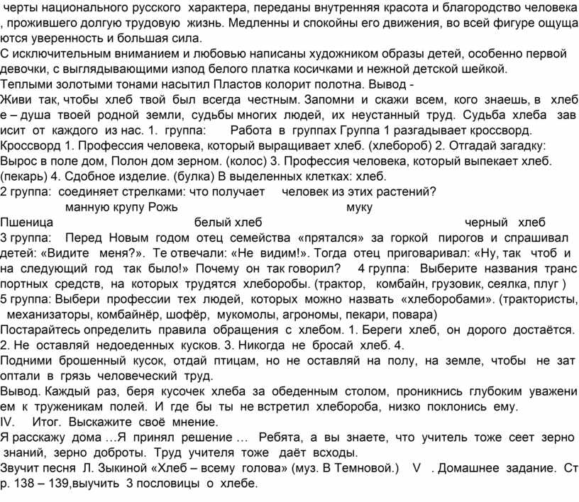 Тема урока: «Хлеб всему голова» Личностные УУД: Формирование чувства прекрасного. Регулятивные УУД: Целеполагание, как постановка учебной задачи, контроль. Познавательные УУД: Рефлексия способов и условий действия, контроль и оценка процесса и результатов деятельности. Подведение под понятие, выведение следствий, анализ, синтез. Коммуникативные УУД: Умение договариваться, находить общее решение. Умение аргументировать свое предложение, убеждать и уступать. Взаимопомощь по ходу выполнения задания Рефлексия своих действий. Умение слушать собеседника. Цели урока: • Раскрыть значение хлеба, важность труда земледельца. •Расширить знания о процессе создания хлеба и о его пользе. •Воспитывать чувство бережного отношения к хлебу. •Формировать интерес литературе ,искусству. • Расширить кругозор, повысить культуру учащихся. • Учить детей работать в группе. Ход урока. Орг. момент. Проверка домашнего задания. Зачем человек трудится? Дети рассказывают о труде своих родителей. Объясните пословицу. Землю красит солнце, а человека труд. Новый материал 1. Притча. Я хотела бы продолжить урок прочитав притчу. А вы постарайтесь определить тему урока. Что такое притча? (рассказ, в котором заключена мудрая мысль) Чему учат притчи? (притчи учат человека правильным поступкам. Учат людей принимать верное решение) Однажды добрый молодец нашел золотой самородок. Обрадовался. Поднял его и понес к ювелиру, спросил: Сколько стоит мой самородок? 1000 руб. – ответил ювелир. Не поверил молодец, пошел к другому торговцу. Тот оценил его самородок в 5 тысяч рублей. Третий же ювелир сказал: Стоит твоя находка 10 тысяч рублей. Совсем растерялся юноша и решил пойти к мудрецу за советом. Я знаю, что ничего нет дороже золота на земле, сказал он седобородому старцу, но не могу я установить истинную цену самородку. Взял в руки золото мудрец: “Твоя находка, добрый молодец, стоит целого состояния. Но не гордись этим, потому, что ты ошибаешься, что золото дороже всего на свете. Попробуй неделю не поесть – отдашь самородок за кусок хлеба. Вот и разумей теперь, что самое ценное в нашей жизни”. Что же самое ценное в нашей жизни? Какова главная мысль этой притчи? Прочитайте («Попробуй неделю не поесть – отдашь самородок за кусок хлеба», т.е. хлеб дороже золота) Так ли это? Мы постараемся ответить на этот вопрос? О чём мы будем говорить на уроке? Чему мы будем учиться? УЗНАТЬ … (новое по теме, полезность данных продуктов, когда появился хлеб) ПОВТОРИТЬ … (какие бывают хлебобулочные продукты, кто такие хлеборобы) ПОМНИТЬ! (о том, что нужно бережно относиться к хлебу, уважать труд взрослых) Почему же хлеб дороже золота? Почему так говорят : «Хлеб всему голова»? Вот почему так важен труд хлебороба. А что значит слово «хлебороб»? (тот, кто работает – делает хлеб) Даже в самом названии этой благородной профессии слова «хлеб» и «работа» соседи. Хлебороб должен знать и любить землю, быть терпеливым и выносливым. А для чего хлеборобу терпение и выносливость? (хлеб долго растёт , плоды труда видны не сразу, их нужно дождаться) Я хочу, чтобы вы сами нашли ответ на эти вопросы, проследив путь, который проходит зёрнышко, чтобы прийти к нам на стол в виде ароматного, мягкого хлеба. Составим цепочку превращения зерна в хлеб. Определите профессии людей, которые помогают хлебу прийти на стол. На доску прикреп