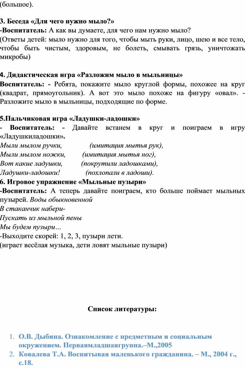 - дидактическая игра «Разложи мыло в мыльницы»; -пальчиковая игра «Ладушки-ладошки»; - игровое упражнение «Мыльные пузыри».