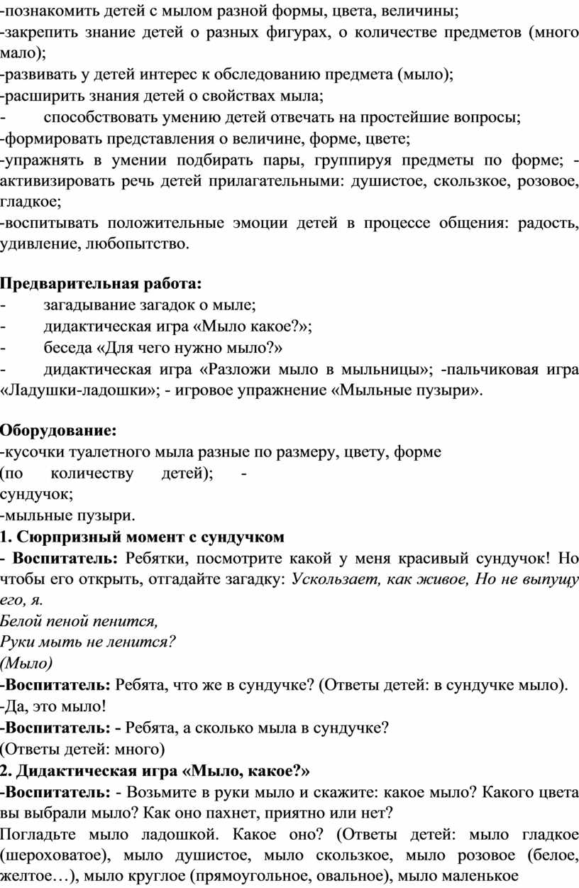-познакомить детей с мылом разной формы, цвета, величины;