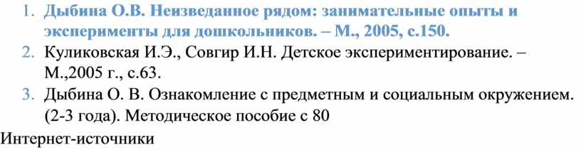 3. Дыбина О.В. Неизведанное рядом: занимательные опыты и эксперименты для дошкольников. – М., 2005, с.150.