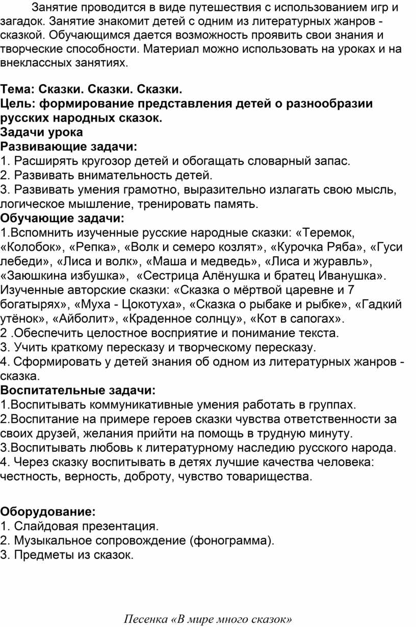 Занятие проводится в виде путешествия с использованием игр и загадок. Занятие знакомит детей с одним из литературных жанров - сказкой. Обучающимся дается возможность проявить свои знания и творческие способности. Материал можно использовать на уроках и на внеклассных занятиях.