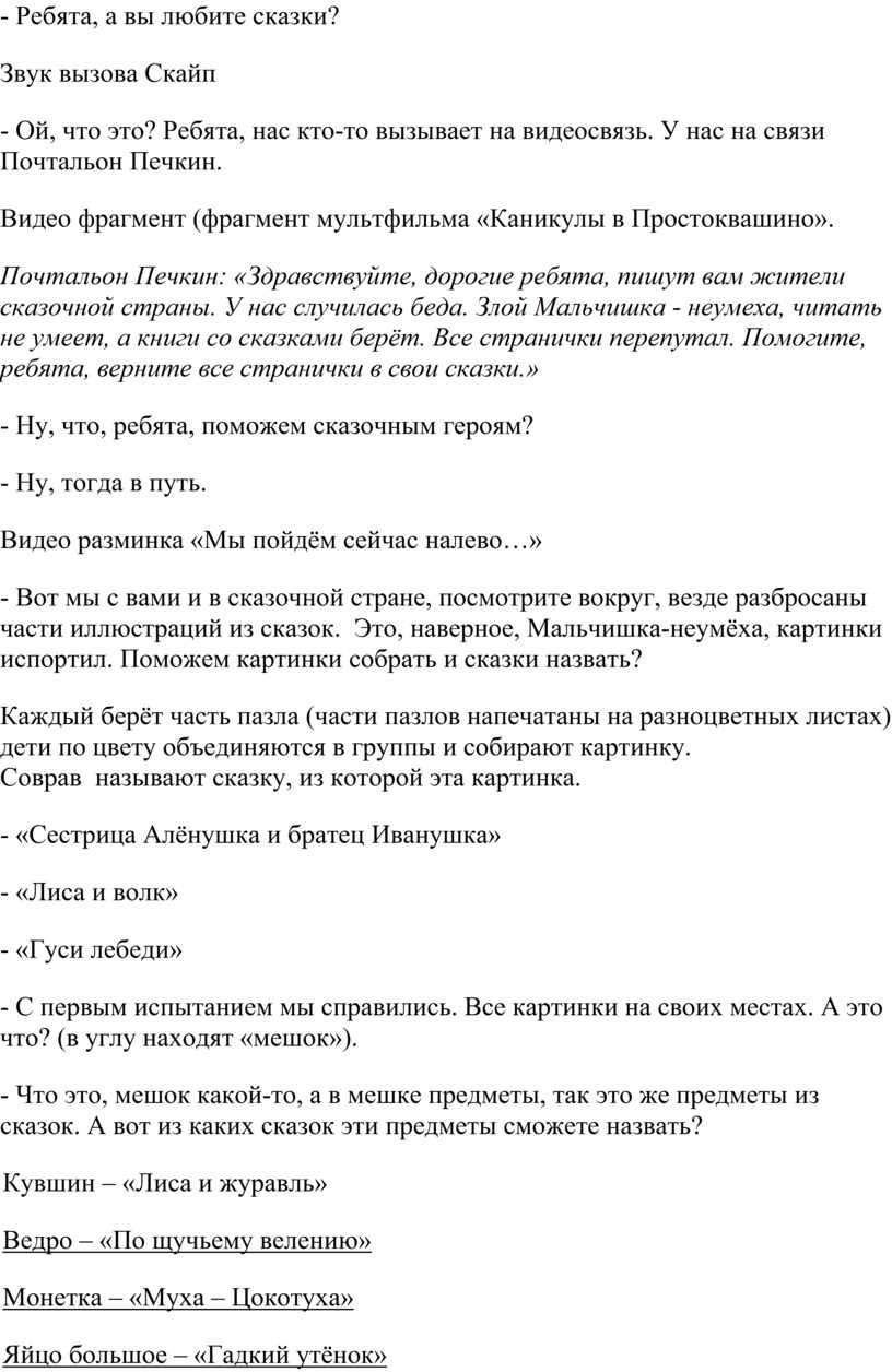 Почтальон Печкин: «Здравствуйте, дорогие ребята, пишут вам жители сказочной страны. У нас случилась беда. Злой Мальчишка - неумеха, читать не умеет, а книги со сказками берёт. Все странички перепутал. Помогите, ребята, верните все странички в свои сказки.»