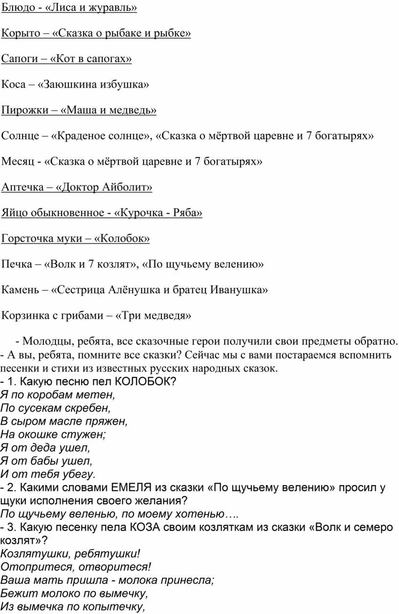- Молодцы, ребята, все сказочные герои получили свои предметы обратно. - А вы, ребята, помните все сказки? Сейчас мы с вами постараемся вспомнить песенки и стихи из известных русских народных сказок.