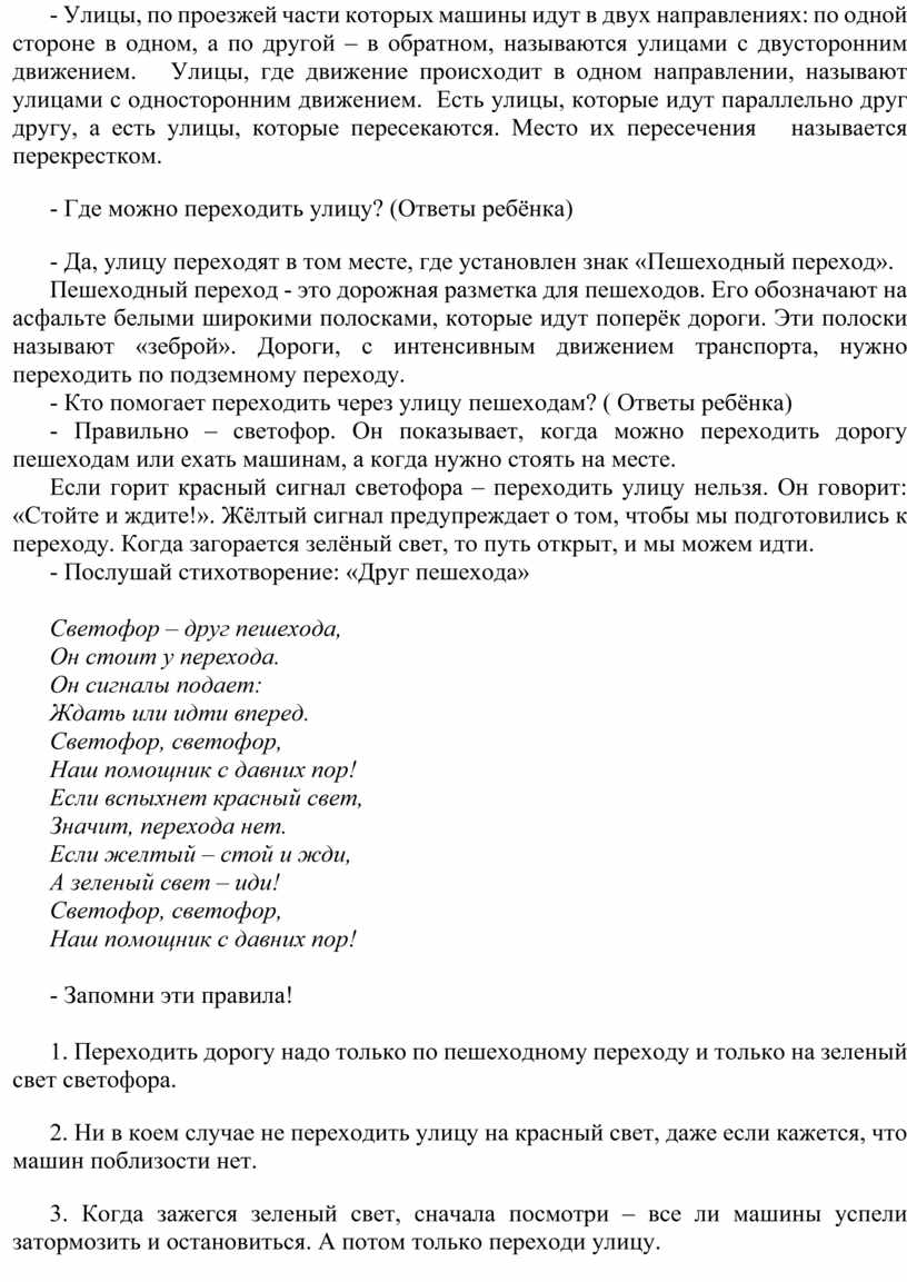 - познакомить с правилами передвижения пешеходов по улице, с понятиями «переход», «пешеход», «светофор».