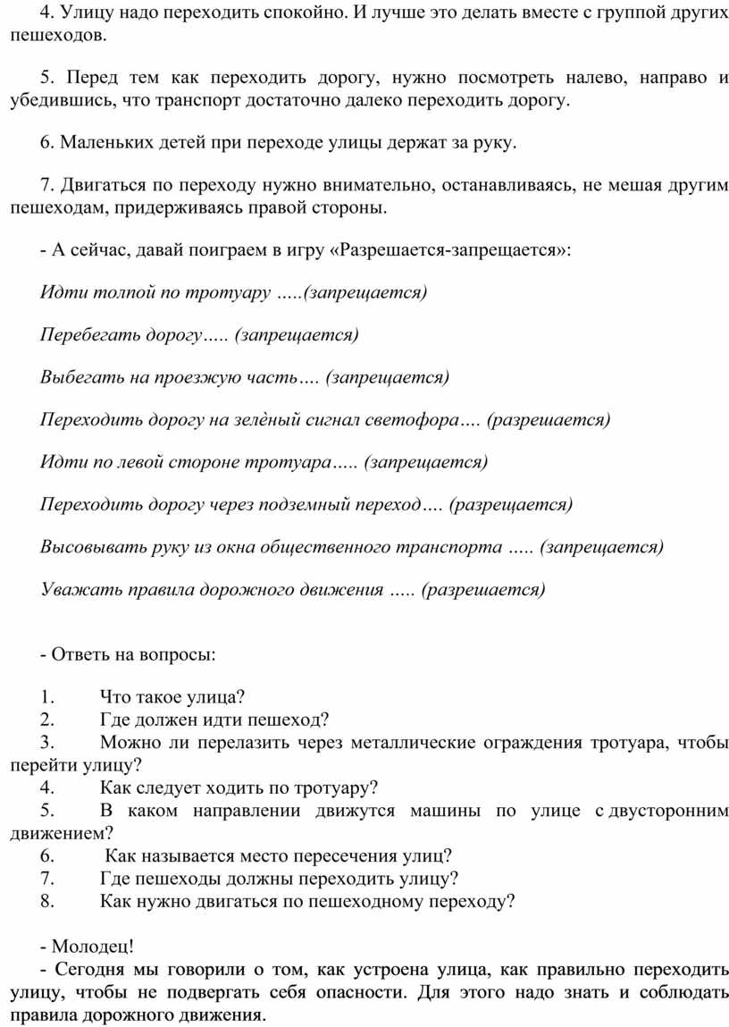 - Сегодня мы говорили о том, как устроена улица, как правильно переходить улицу, чтобы не подвергать себя опасности. Для этого надо знать и соблюдать правила дорожного движения.