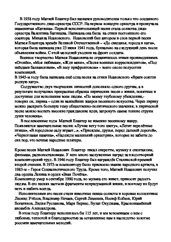 Кроме песен Матвей Исаакович Блантер писал оперетты, музыку к спектаклям,