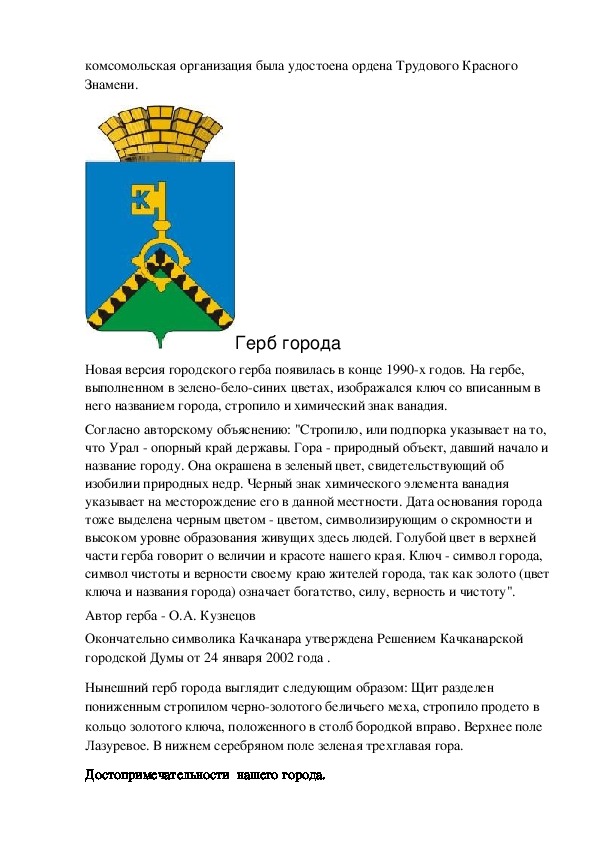 части герба говорит о величии и красоте нашего края. Ключ символ города,