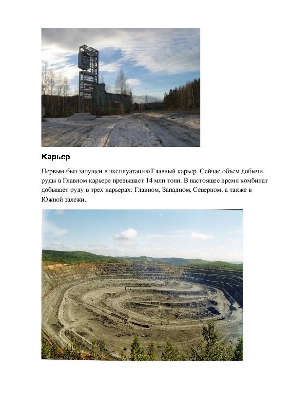 добывает руду в трех карьерах: Главном, Западном, Северном, а также в