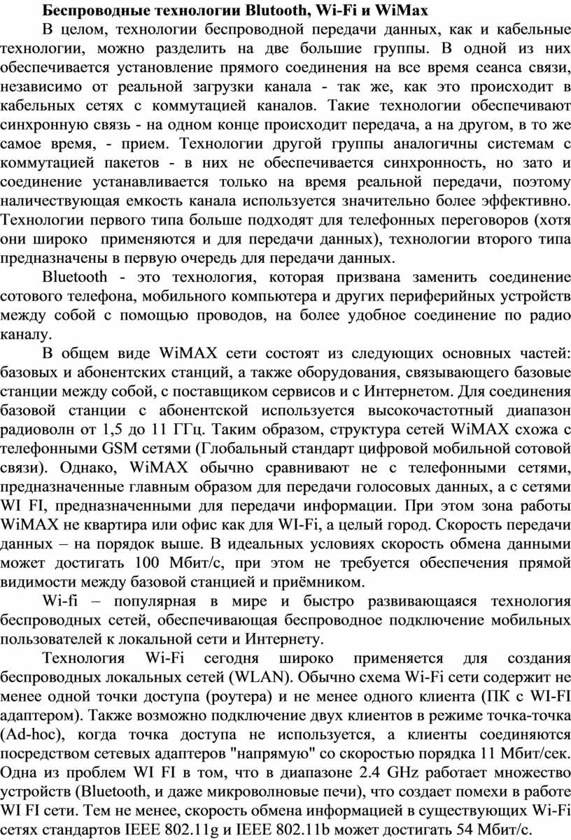 Беспроводные технологии Blutooth, Wi-Fi и WiMax