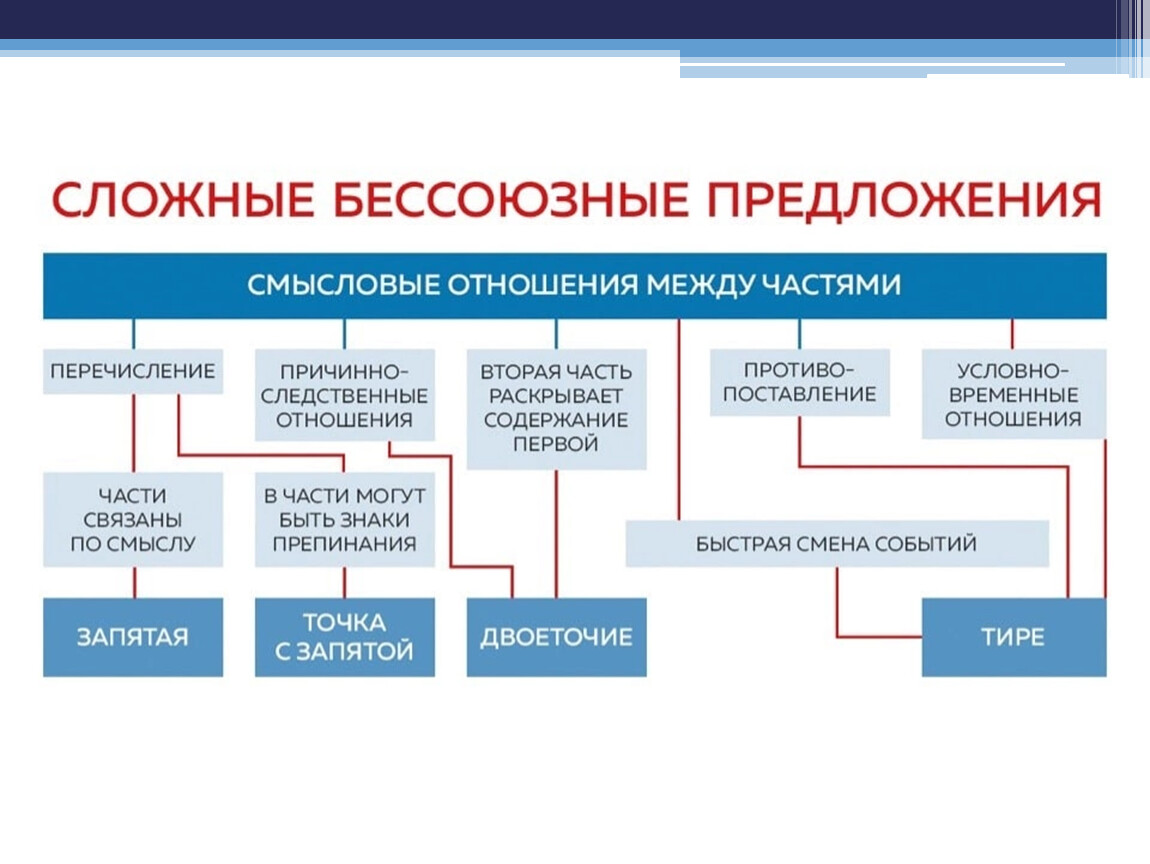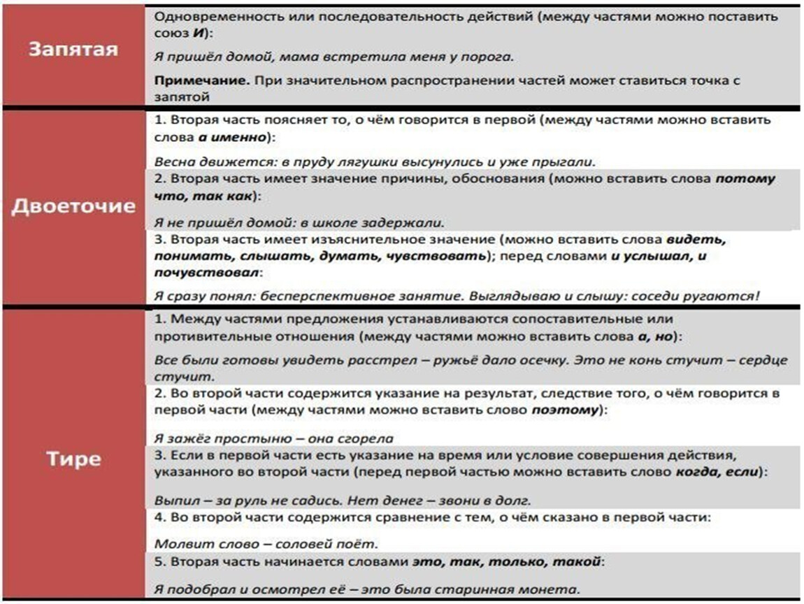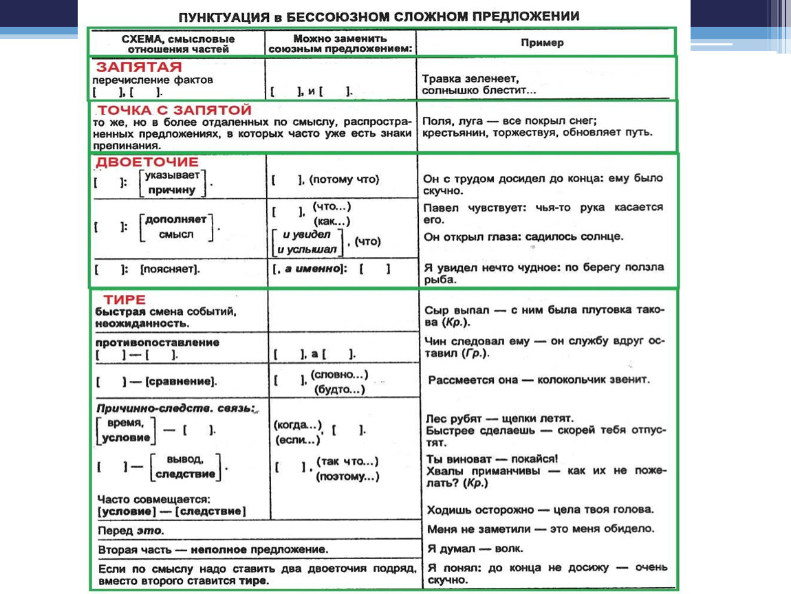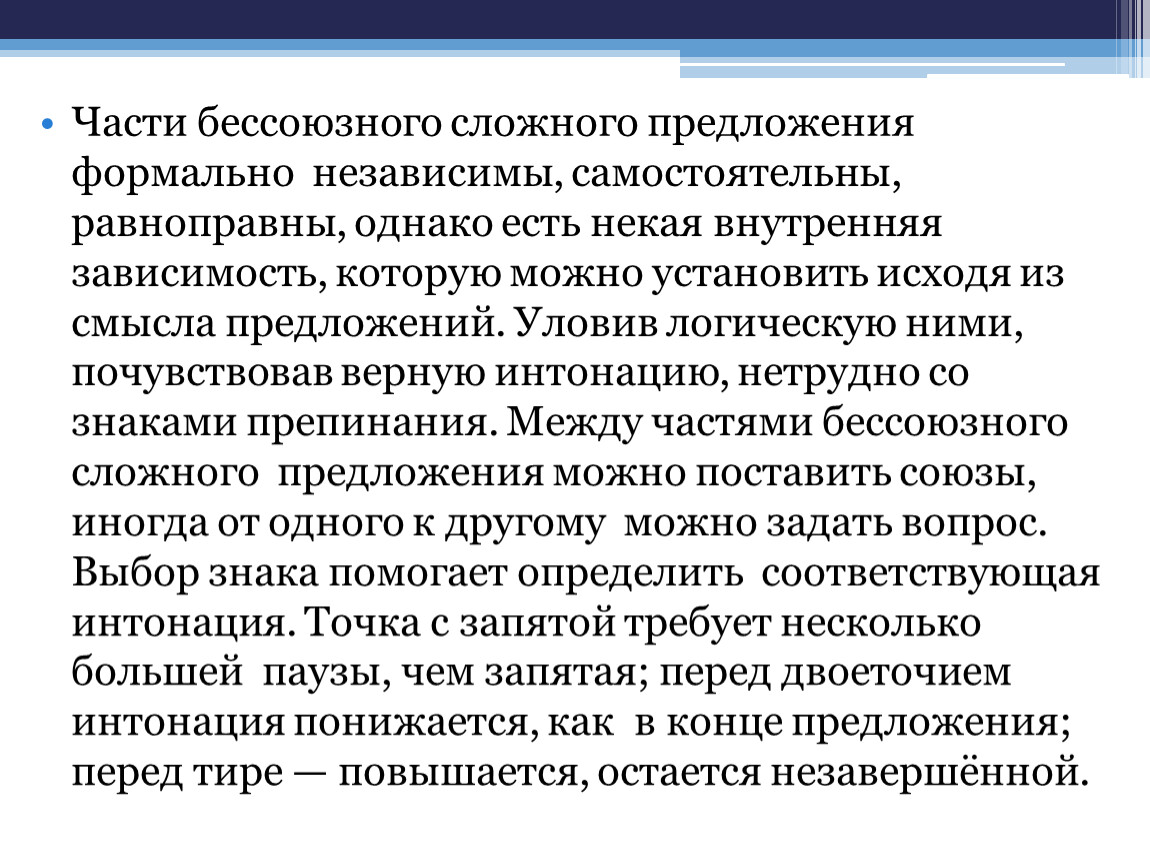Части бессоюзного сложного предложения формально независимы, самостоятельны, равноправны, однако есть некая внутренняя зависимость, которую можно установить исходя из смысла предложений. Уловив логическую ними, почувствовав верную интонацию, нетрудно со знаками препинания. Между частями бессоюзного сложного предложения можно поставить союзы, иногда от одного к другому можно задать вопрос. Выбор знака помогает определить соответствующая интонация. Точка с запятой требует несколько большей паузы, чем запятая; перед двоеточием интонация понижается, как в конце предложения; перед тире — повышается, остается незавершённой.